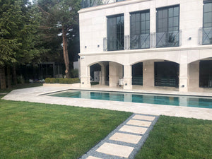 The standard finishes for pavers and copings are smooth sandblasted (sandblasted and brushed), fine sandblasted, sandblasted, antiquated and tumbled. The standard thicknesses are 2 and 3 cm.